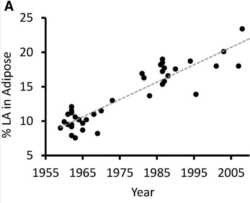 A matter of threshold. Some studies have actually used fat tissue biopsies to look at the amount of PUFA accumulated in the body and compared that level to heart disease risk.16 Unfortunately these studies have the same problems as I just listed above, and moreover, none of them was performed recently enough to assess current PUFA levels, which have increased dramatically.