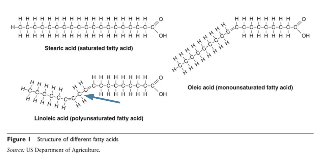 Why do PUFAs like LA increase this vulnerability, as opposed to other fats? The key is a particular carbon that is contained only in polyunsaturated fats. You can see it in the diagram below. The carbon I am talking about is the one located between the two carbons that are connected to double bonds (arrow). This carbon is prone to oxidation during times of oxidative stress. When it becomes oxidized, it makes the fat unstable. When the unstable fat breaks down, it produces toxic byproducts. These toxic byproducts are what actually cause the inflammation, directly damaging your cell membranes, damaging your proteins, and even damaging your DNA.